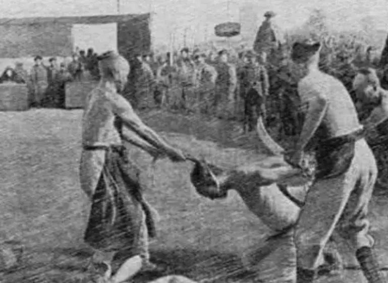 游街示众的犯人,将手脚都绑在了木棍上,可以看出还是一位女犯人。