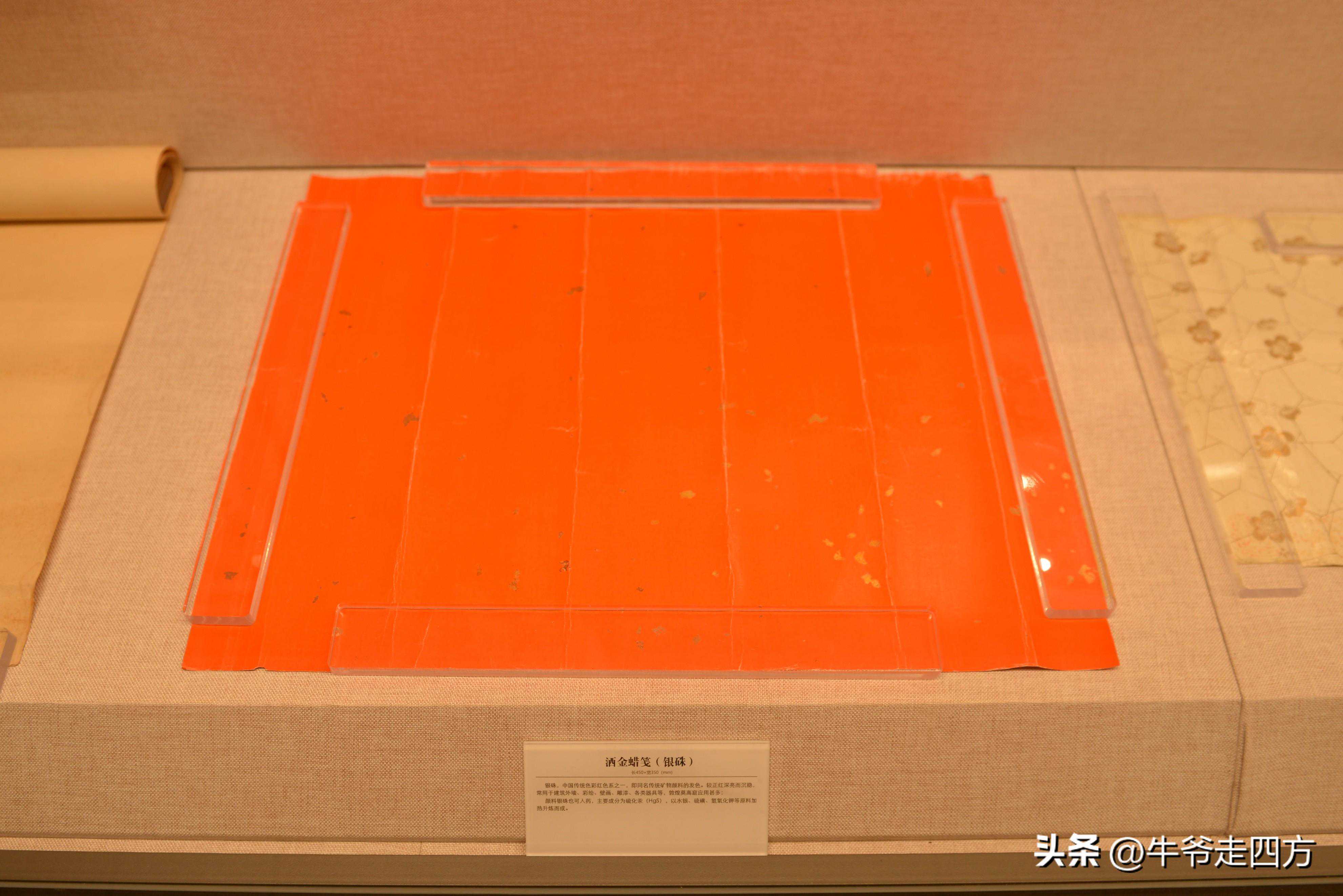 洒金蜡笺(银硃)。银硃是中国传统色彩红色系之一,即同名传统矿物颜料的发色。较正红深亮而沉稳,常用于建筑外墙、彩绘、壁画、雕漆、各类器具等,敦煌莫高窟应用甚多。颜料银硃也可入药,主要成分为硫化汞,以水银、硫磺、氢氧化钾等原料加热升炼而成。